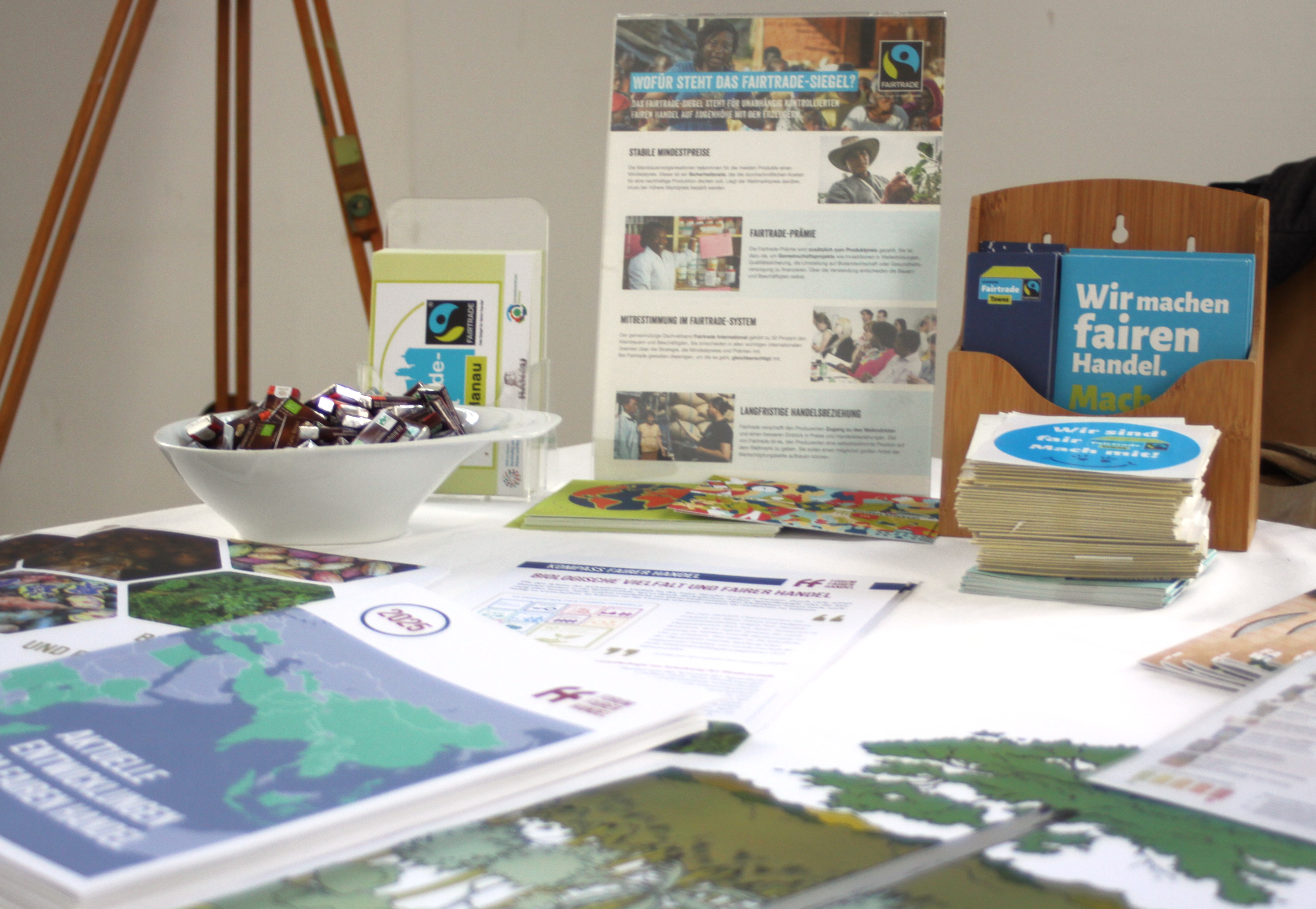 Am Stand der Steuerungsgruppe haben Interessierte einen Einblick in die Arbeit sowie in aktuelle und geplante Aktivitäten rund um den fairen Handel in Hanau bekommen. Viele Besucherinnen und Besucher nutzten die Gelegenheit zum Austausch und brachten wertvolle Ideen ein, welche Aktionen sie sich künftig zum Thema Fairtrade wünschen. Die gesammelten Anregungen reichen von Informationsveranstaltungen bis hin zu einem fairen Frühstück.